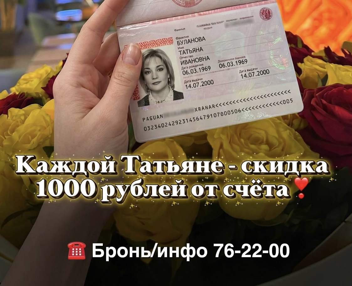 25 января в нашем ресторане каждая Татьяна получит скидку 1000 рублей от суммы счета.🎉